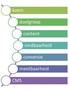 Er zijn zeven aspecten, of succesfactoren, die wat mij betreft cruciale voorwaarden zijn om te komen tot een succesvolle website. Deze staan opgesomd in de afbeelding hiernaast.